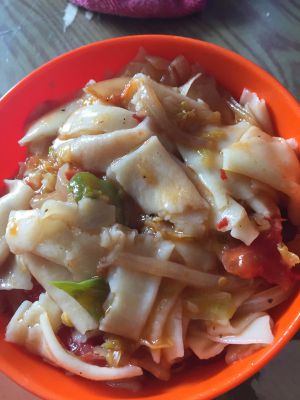 煮好的面片用凉水过凉水,两到三遍就可以了,将过好水的面片放入之前炒好的蔬菜当中,用力把蔬菜和面片搅拌均匀,之后就可以吃了,加上盐醋辣椒,就是一碗香香的炒面片了。