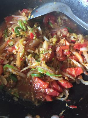 油温烧到八分热的时候放入洋葱,炒五分钟之后加入两勺豆瓣酱,翻炒匀豆瓣酱之后依次放入包菜,辣椒,西红柿。