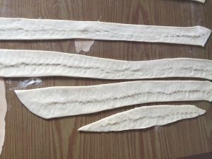 将醒好的面擀开,不要太薄也不要太厚,将擀好的面切成半指宽的长条,面太厚的时候用手指长两边挤压。