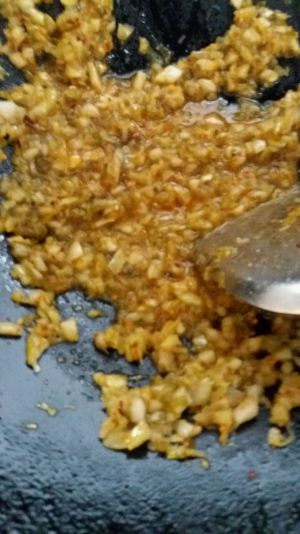然后把油放进锅里,听见油的响声了,就把面条放进去炒