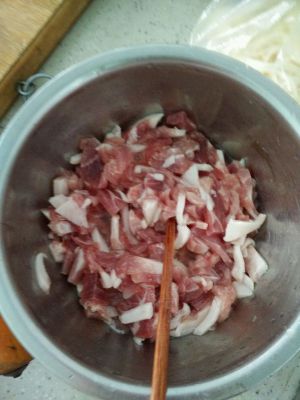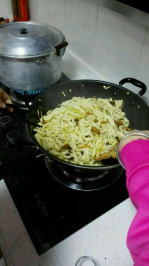 冻切面放锅上蒸10分钟至面条变深色,中间挑几次,打散,凉着。忘拍照了。