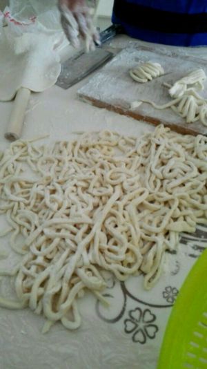 揪一团揉好的面,用擀面棍把面团擀成一张大饼状,卷几层用刀切成一条一条的,面条就形成啦,要吃粗的细的自己决定…