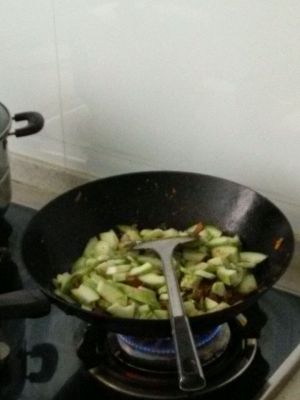 锅里倒油,把肉倒入,翻炒4分钟,放入姜,蒜,翻炒,放入葱,翻炒1分钟,倒料酒,倒醋,倒酱油,加花椒粉,倒入西红柿,青椒,倒入葫芦,