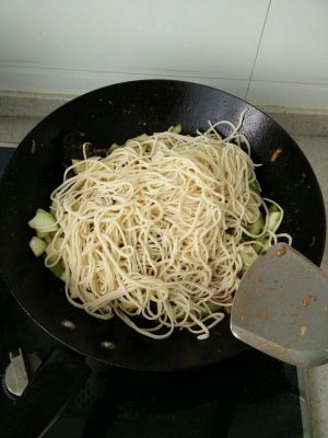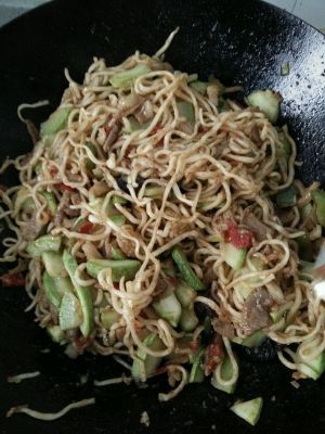 热锅下油先入香菇炒至香味后再入牛肉丝炒至变色后把其它材料一起入锅炒制,加少许盐、鸡精、然后加入备用的面条一同炒制,再加入适量味极鲜酱油提色,最后加入豆芽,出锅前加少量味精或者可不加,撒上葱段,全依个人喜好。