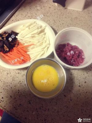 所有配料切丝,鸡蛋液煎熟切丝备用,面条先煮熟,然后过冷水,并抺一点点食用油以防粘住。