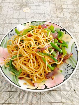 第三步 起锅倒油 放葱蒜 放青椒洋葱 放海鲜酱油少许 炒一会 洋葱八成熟的时候放入煮好的面条 倒入蚝油上色 颜色你满意为止 用筷子炒面 这个是重点 !别用铲子 否则会断 !