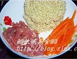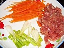 瘦肉切丝后用少量盐、油、生粉拌匀,腌15分钟;