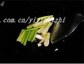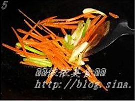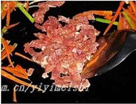 把胡萝卜丝和葱白用铲子拔开一边,倒入瘦肉丝煸炒至变白,把材料全部盛起;