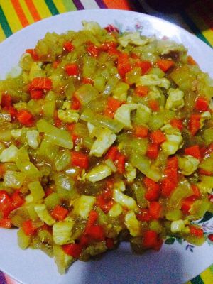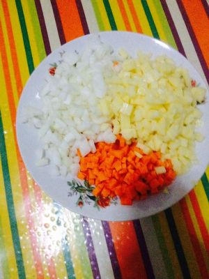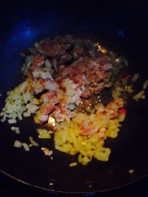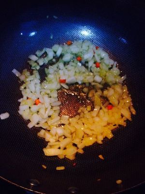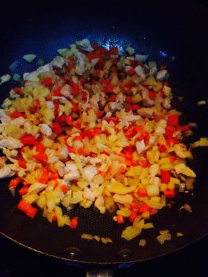 热锅热油下鸡丁翻炒,待鸡丁变色加洋葱 ,再依次加入土豆,胡萝卜,豌豆米。