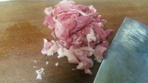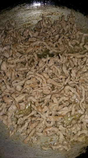 开火,锅中倒油 油温5成热下肉丝,小火慢炒,炒好成出备用。