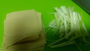 一块豆腐皮,加些肉丝一些葱丝包裹好。装盘