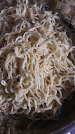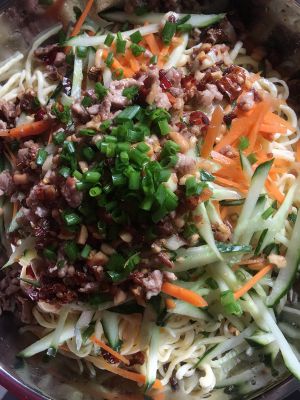 炒酱前把黄瓜和胡萝卜丝铺在面上!淋上酱料,撒上葱花,浇热油即可!