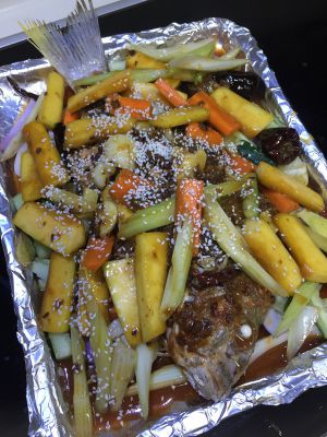 将一条三斤重的锂鱼清洗干净,中间切开分成两半,加料酒,盐,腌制20分钟,放入烤箱上下烤,200度,烤15分钟。取出,洒上花椒粉,鲜辣粉,孜然粉,生姜粉,胡椒粉,鸡精,食用油,红油,蒸鱼豆鼓等,再放入烤箱烤15分钟。