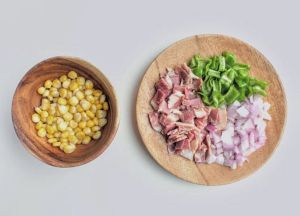 玉米粒用沸水焯一遍,培根、青椒、洋葱切小块