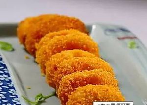 过三关:取三个物斗分别装着面粉、蛋液、面包糠。取一点土豆在面粉中裹一下,搓成圆饼状。再过一遍蛋液和面包糠。