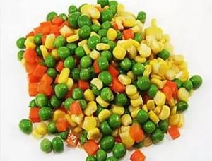 蔬菜飞水:锅中倒水,加入油、盐,烧开后倒入胡萝卜粒、青豆、玉米粒,煮两分钟后捞出滤干水分;