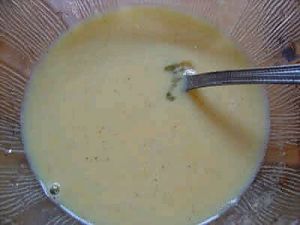 4.倒入调好的牛奶鸡蛋汁,加适量面粉,拼命地搅啊!