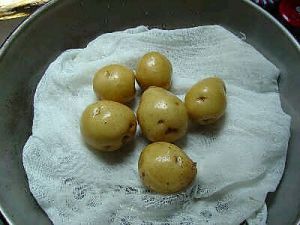 1.洗干净土豆,上屉锅蒸(私下认为,用高压锅热也不错,而且很方便呢!不过,建议没用过高压锅的朋友不要冒险呀!)