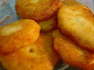 5.将加过面粉(定形)后成的土豆饼雏形放进平底锅里炸,记得用小火来做,否则会影响土豆饼的色泽。