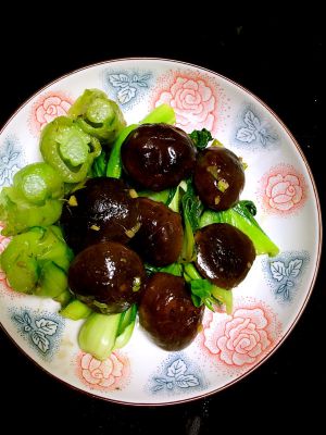 热油葱姜蒜下锅,炒香菇和菜根,然后放菜叶。加点生抽耗油,盛盘摆菜,有事青菜水里泡久了,发软不好看,即做还是色香味俱全的。