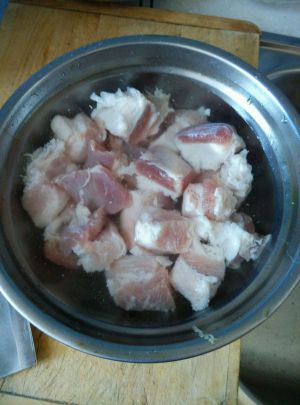 五花肉切块泡水里去除血水。