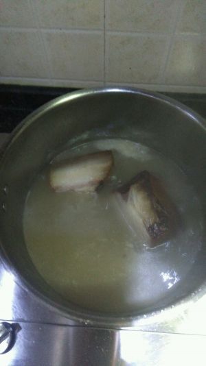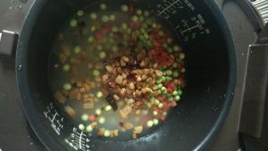 像平时煮饭一样把米和水加进电饭煲,再加入蔬菜和腊肉,再酌情加入食盐!