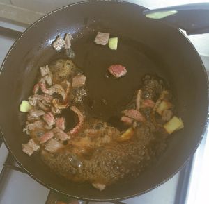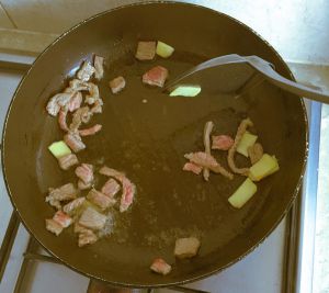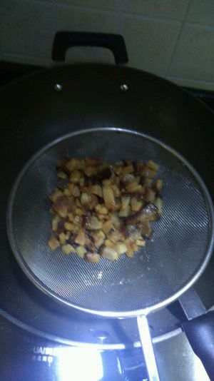 在锅里炒煸一下腊肉,把多余的油沥出来,不然你的饭会很油!