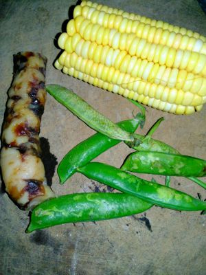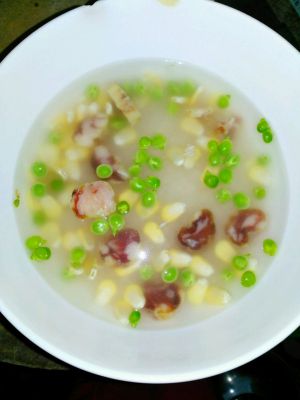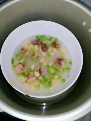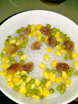 把豌豆剥壳,玉米掰粒加入米中,再放点盐,这样米饭会有味道些。