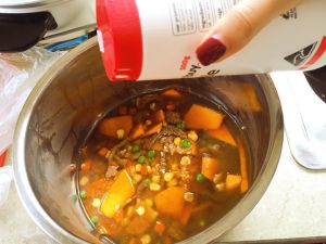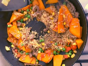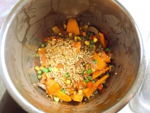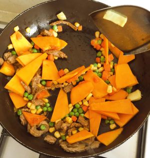 南瓜下锅翻炒两下,玉米粒豌豆粒一起下锅