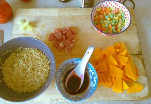 准备食材 牛肉切薄片(也可用五花肉,鸡肉...),南瓜切片,四五片姜片,一小碗的速冻玉米豌豆胡萝卜丁(也可新鲜的蔬菜自己切丁),洗好的一碗糙米,一碗酱汁(一勺蚝油,一勺老抽,半勺生抽,半勺料酒)
