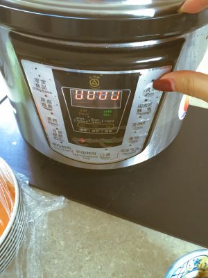 将准备好的食材全部投入九阳豆浆机里,按选择键、什锦饭档,再按开始键