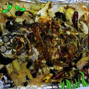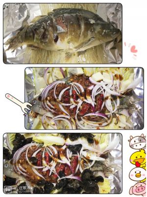 把鱼拿出来摆好,把汁儿浇上~ 用锡纸垫底 别盖上要不不爱熟- 放入烤箱230度烤40分钟!根据各家烤箱温度掌握