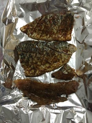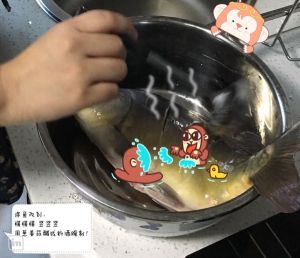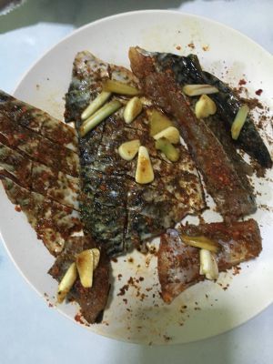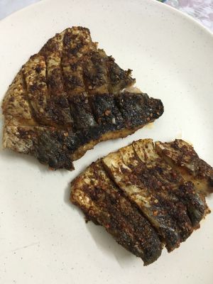 大家还记得我上一篇吃的鱼头泡饼么,这是鱼身,我选的鱼尾那部分。解冻,肚皮处切开,背部相连,切花刀,抹盐+料酒+生抽+葱姜蒜腌制半小时。