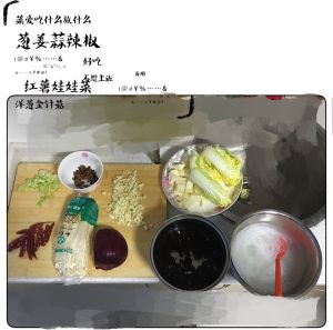 此步骤没拍照片,油热(油比平常炒菜多些一些)+葱姜蒜爆香+豆瓣酱(不爱辣的放豆豉)炒出油+木耳香菇炒+生抽+半茶匙老抽翻炒+热水少许,关火前加其他蔬菜。