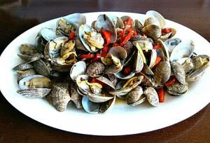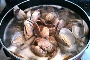 热锅热油,下花蛤翻炒1分钟。加入适量水,大火焖煮。至花蛤全部张开口。