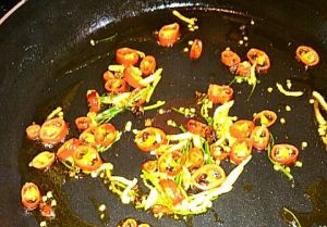炒锅入油,八成热时姜蒜粒、辣椒段下锅爆香