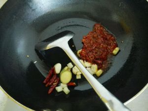 油热后,把调料都倒进去爆炒。