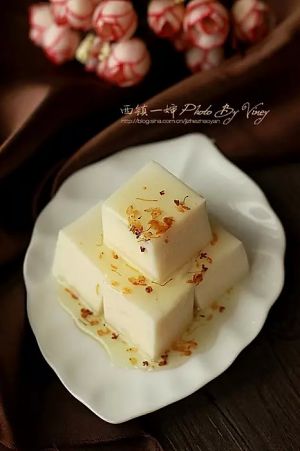 将杏仁豆腐切块放入碗中,盛一些桂花糖水就可以吃了