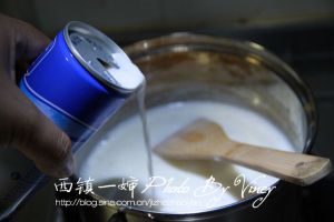 、然后再倒入整罐的杏仁露,还有剩下的牛奶,细砂糖,继续加热,不停搅拌。煮至糖溶化即可。