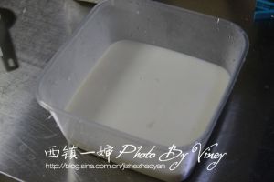 准备一个容器,容器内铺上纱布垫底,倒入煮好的杏仁牛奶液,充分滤掉气泡和浮末。