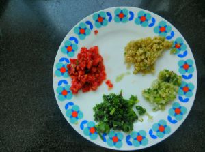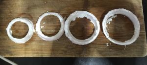 准备好所有材料,把取洋葱的几个圈圈,中间剩下的切丁,火腿肠切丁。