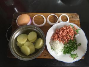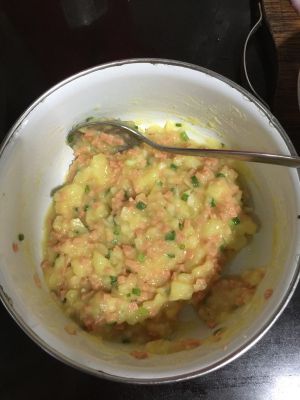 土豆擦丝儿,葱姜胡椒粉盐,鸡蛋,面粉少量。拌匀。