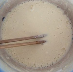 分次將純淨水、母乳或者配方奶加入混合物,直至混合物可以緩慢流動。