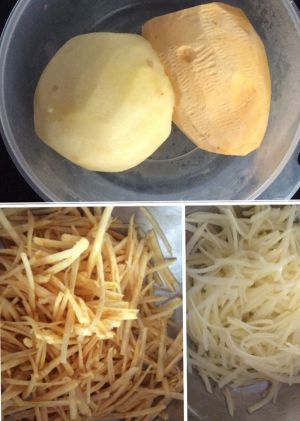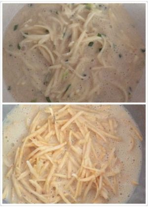 面糊分两份,分别倒入土豆丝和红薯丝里面,拌拌均匀