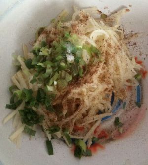 因为土豆饼是咸的,所以放葱花、盐、花椒粉,调味一下
