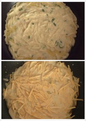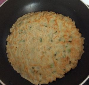 舀一湯勺混合液倒在不粘鍋中間,任其自然流淌,煎到表面冒泡(大約3、4分鐘),輕輕翻面,再煎1、2分鐘。盛出待涼。