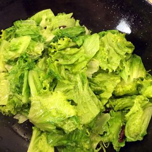 生菜用辣椒爆炒一下,放碗底。(垫底青菜可根据个人口味稍作调整)