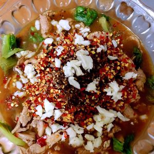 将煮熟的里脊肉捞出放在生菜上,浇上汤汁,放花椒碎和辣椒碎,撒上蒜末。淋上少许热油即可。