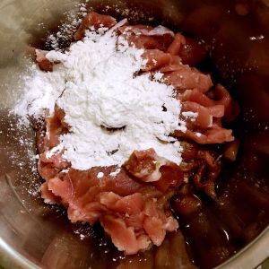 里脊肉切薄片,加入适量料酒,加适量植物油和淀粉抓匀腌制备用。