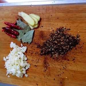 准备调料。(花椒干锅内焙熟,研碎后备用。)